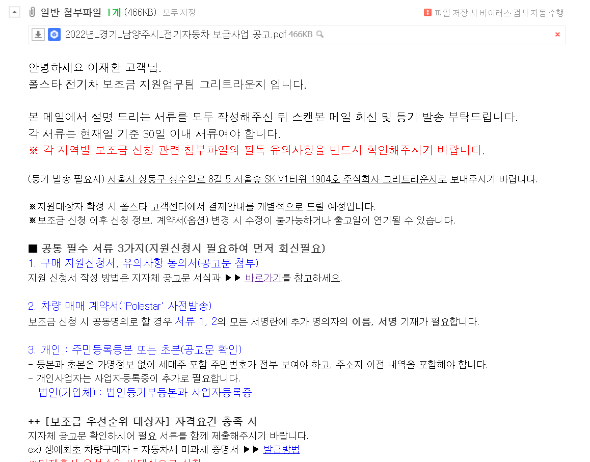 몇가지 설문을 하게되면, 보조금 신청 관련 서류 작성 메일이 오게됩니다.