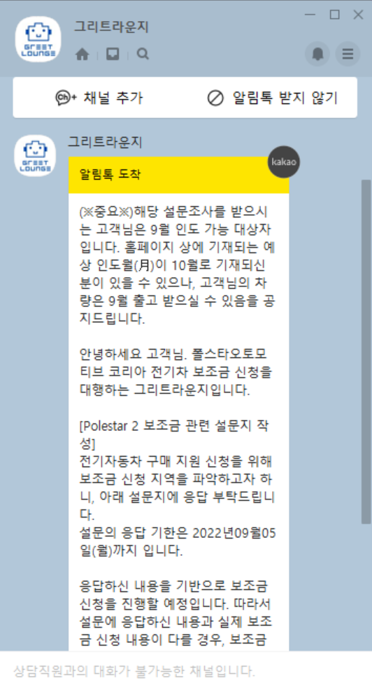 그 다음 보조금 관련 설문 카카오톡 메시지와 문자가 옵니다.