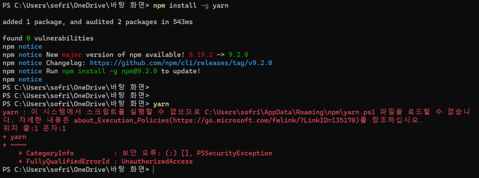 윈도우에서 yarn 을 설치 후 실행하면 아래와 같이 보안오류가 발생합니다.
