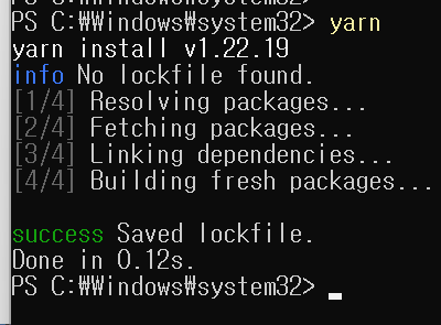 이후 yarn 명령을 실행하면 정상 실행됨을 확인 가능합니다.