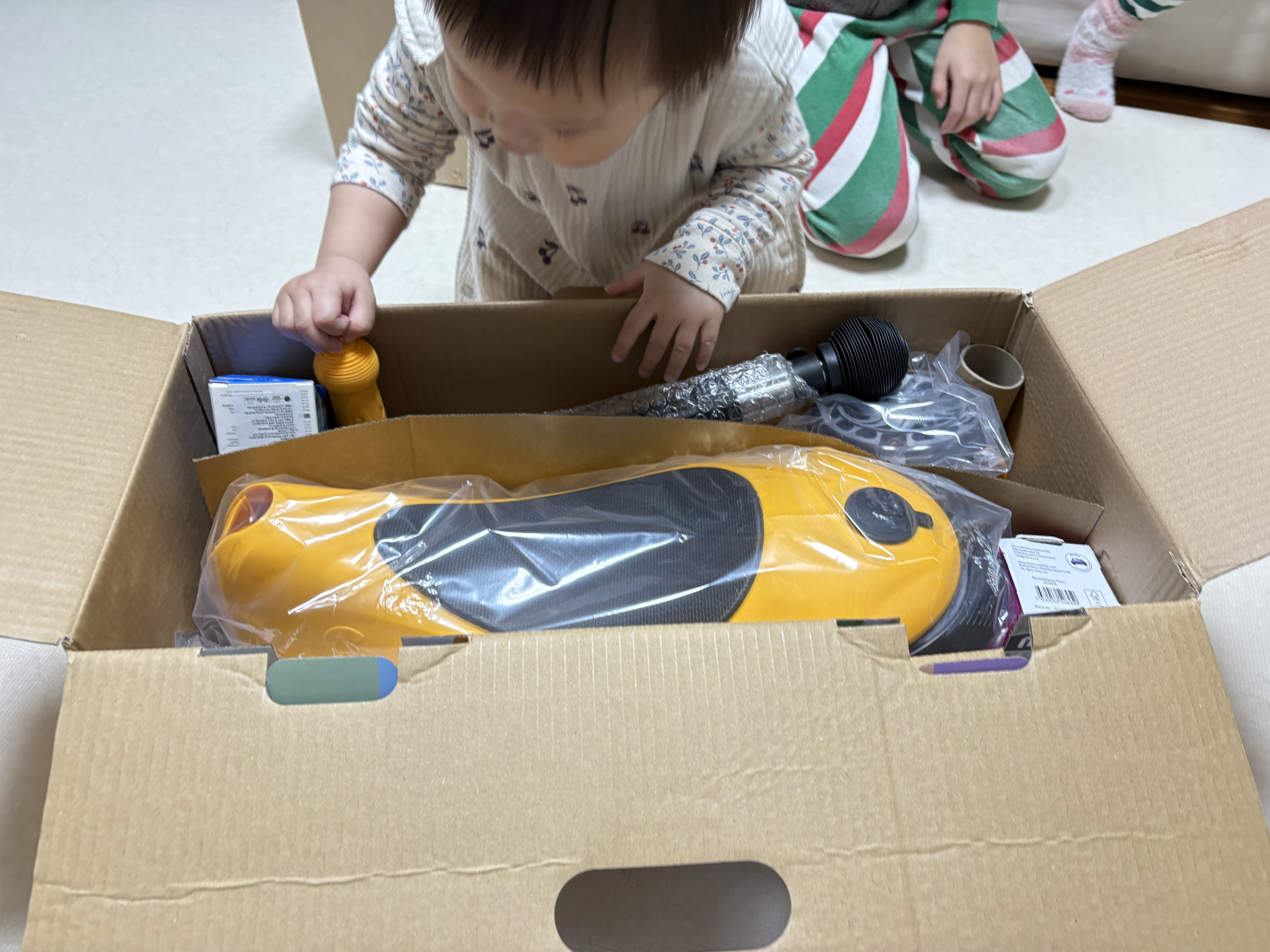 박스 오픈! 사은품들도 같이 박스에 들어있었다. 자기건 줄 어떻게 알고 달려드는 아기.