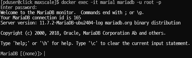 [pduser@click maxscale]$ docker exec -it maria2 mariadb -u root -p